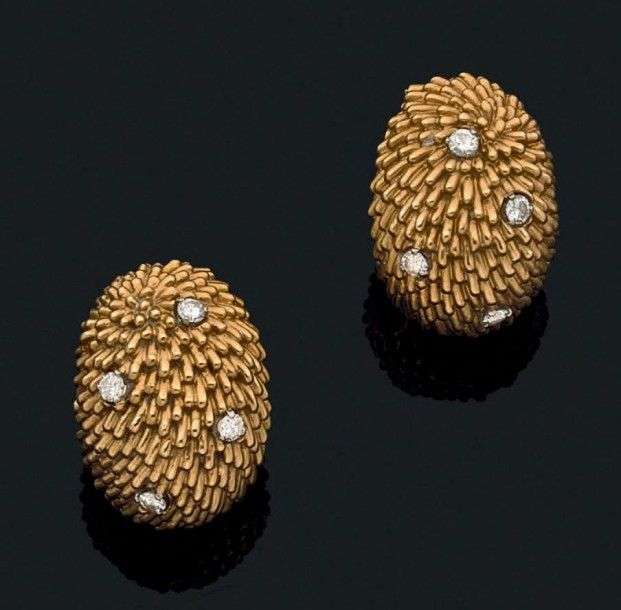 Paire de clips d'oreilles "hérisson" en or jaune 18k ciselé et platine sertis de diamants de taille brillant. Signée et numérotée
