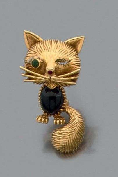 Petit clip "chat malicieux" en or jaune 18k orné d'un cabochon d'onyx pour le corps et d'une émeraude pour l'oeil. Signé et numéroté.
