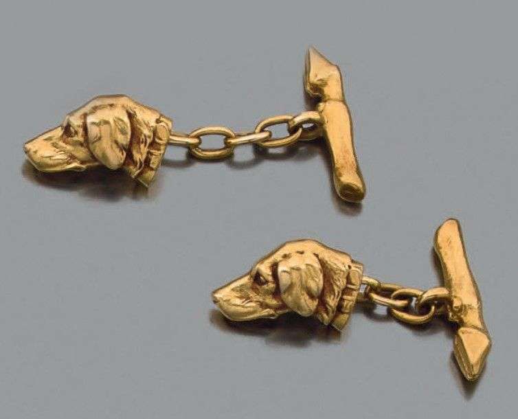 Paire de boutons de manchettes en or jaune 18k composés d'une tête de chien et un pied d'honneur.