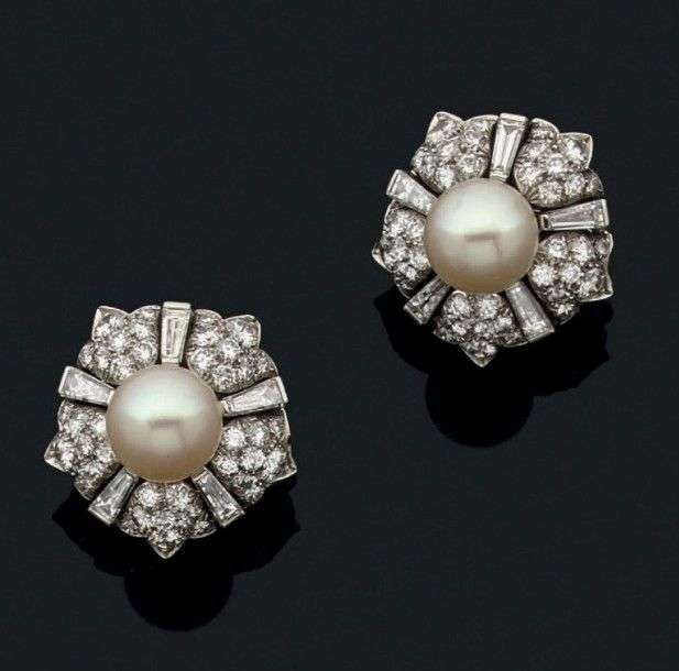 A cultured pearl, diamond and platinium pair of earrings