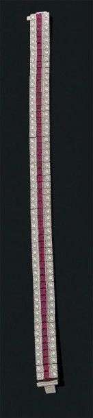 Bracelet "ruban" en or gris 18k serti d'une ligne de rubis calibrés épaulés de deux lignes de diamants de taille brillant.