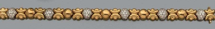 Bracelet articulé composé de mailllons stylisés en or jaune 18k alternés de maillons en or gris 18K pavés de brillants.