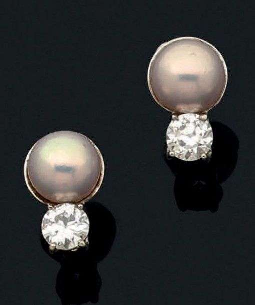 Paire de clips d'oreilles en or gris 18k sertis d'une demi perle grise et d'un diamant de taille moderne.