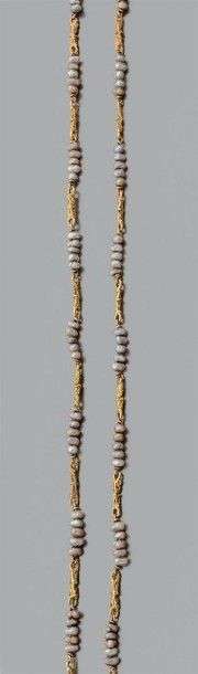 Sautoir composé de motifs en or jaune 18k martelé alternés de petites perles baroques grises.