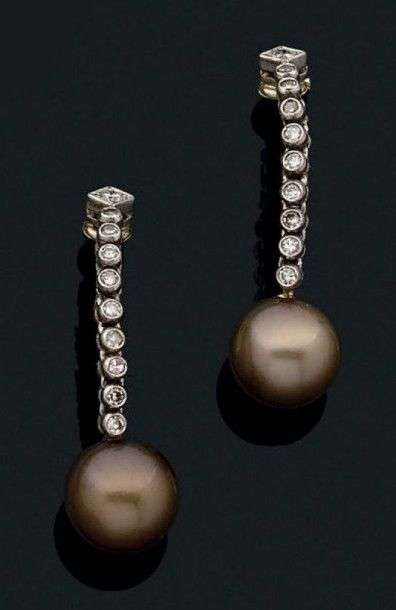 Paire de pendants d'oreilles en gris 18k composés d'une chute de diamants de taille brillant retenant une perle de culture de couleur bronze.