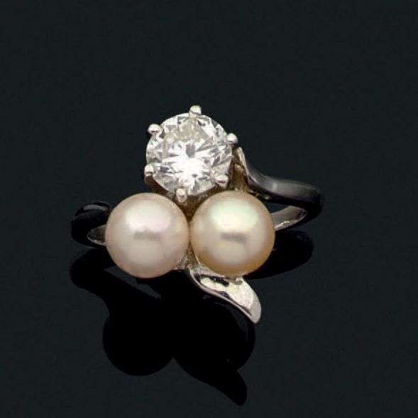 Bague "toi et moi" en platine sertie d'un diamant de taille moderne et de deux perles de culture.