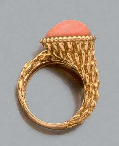 Bague de petit doigt en or jaune 18k martelé ornée d'un cabochon de corail de forme poire. Signée.