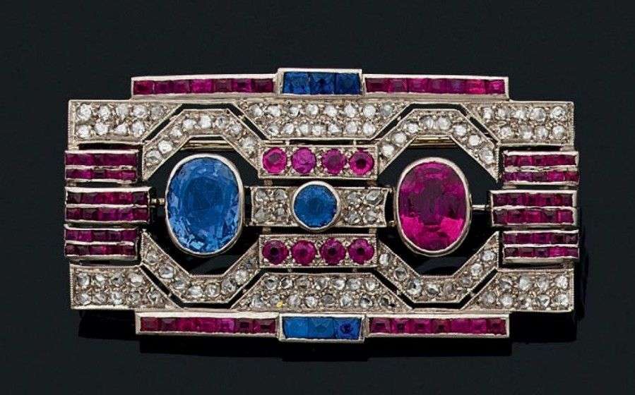 Broche rectangulaire en platine ajourée sertie d'un saphir bleu et un saphir rose dans un entourage pavé de diamants taillés en rose, de saphirs et de rubis calibrés