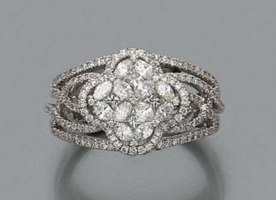 Bague en or gris 18k composée d'une fleur stylisée sertie de diamants de taille navette, princesse et brillant sur une monture ajourée de lignes ondulées serties de diamants de taille brillant.