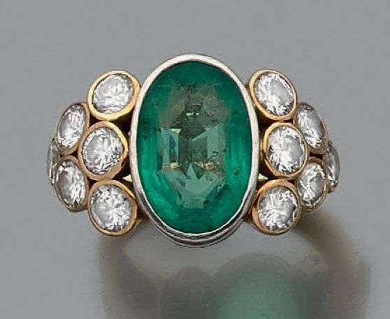 Bague en jaune 18k et platine sertie d'une émeraude épaulée de diamants de