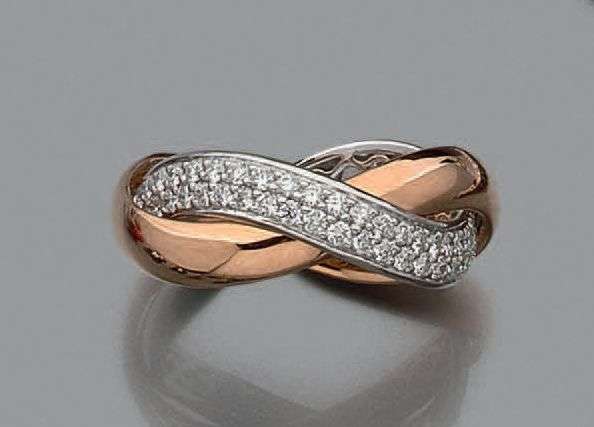 Alliance "Tresse" en or jaune et gris 18k composée de deux anneaux entrelacés, l'un serti de diamants de taille brillant. Signée et numérotée