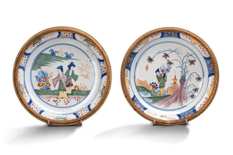 Paire d'assiettes en faïence à décor au chinois de scènes de la vie quotidienne, le marli garni d'une couronne de lauriers en laiton doré.