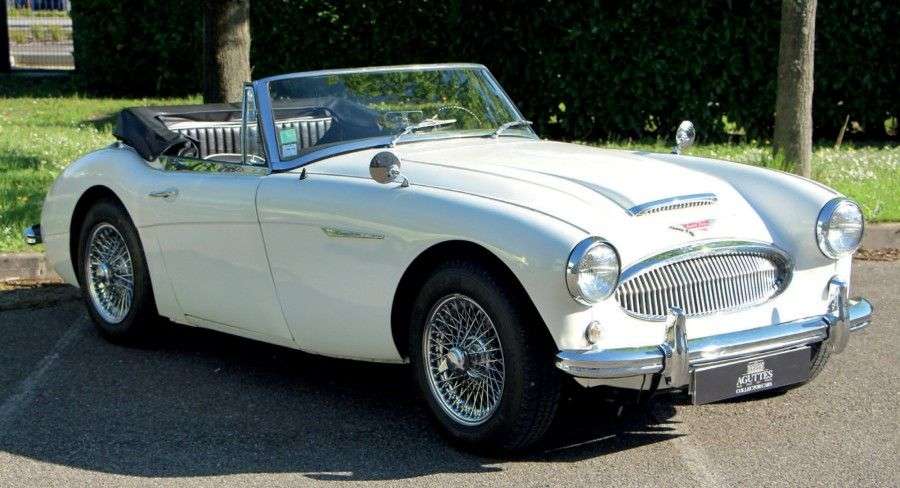 1963 - AUSTIN HEALEY 3000 MK2 BJ7 «Un overdrive à plaisir...» Marque: Austin Healey Modèle: 3000 MK2 BJ7 Millésime: 1963 Kilométrage: 56 370 miles au compteur Motorisation: 6 cylindres en ligne Cylindrée: 2 912 cm3 N° de châssis: 64BHJ7L24275 Carte grise française / French registration L'Austin-Healey 3000 est lancée en 1959 et remplace l'Austin- Healey 100-6 dans la gamme. C'est un roadster sportif qui sera construit jusqu'en 1967. Ce modèle obtint le surnom de «Big», en référence à son gros moteur de 3 litres de cylindrée. A son arrivée, la carrosserie reste identique à celle de son ainée mais l'ancien moteur 6 cylindres de 2,6 litres de cylindrée est remplacé par un moteur de 2 912 cm³ avec 2 carburateurs SU et des freins à disque à l'avant. La puissance s'établit désormais à 124 chevaux Elle s'appelle à l'époque Austin-Healey 3000 et ne deviendra Mk 1 que lorsque la Mk 2 entrera en série. Ce modèle initial fut produit de 1959 à 1961 et était désigné BT7 pour les versions 2+2 et BN7 pour les versions 2 places. En 1961 sort la 3000 Mk II qui bénéficie de trois carburateurs SU HS4, qui font monter la puissance à 132 ch. Elle reçoit aussi une nouvelle calandre à barrettes verticales. En 1962, la voiture gagne en confort lorsque les side screens latéraux en plastique sont remplacés par des vitres amovibles et qu'une nouvelle capote plus facilement manoeuvrable se referme sur un pare-brise désormais bombé. Le moteur retrouve 2 carburateurs mais conserve 130 ch. Cette version est appelée BJ7 et n'existe plus désormais qu'en version 2+2. Belle et sportive, l'Austin Healey 3000 a su s'imposer durant de nombreuses compétitions aux mains de pilotes renommés tels que Caroll Shelby ou encore Timo Makinen. La 3000 propose une ambiance unique à son bord comme seuls les anglais savent les créer. Sièges à petit dossier enveloppant, volant à trois branches, et compte-tours sous les yeux invitent le conducteur à solliciter les capacités de sa mo