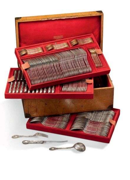 Importante et belle ménagère par Odiot en argent et vermeil, modèle Messonnier et monogrammé, dans son coffret Odiot d'origine à quatre plateaux numérotés. Elle comprend 255 pièces dont: