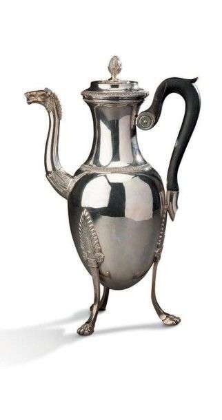 Verseuse en argent posant sur trois pieds griffes à attaches palmettes, le corps de forme balustre souligné d'une armoirie ainsi que d'une frise de feuilles lancéolées, motif repris sur le bec verseur à tête chevaline et en bordure du couvercle, lequel est coiffé d'une prise en forme de gland. Prise en bois noirci.