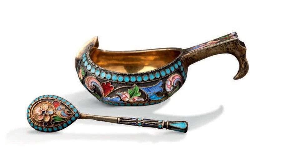 Kvoch et sa petite cuillère en argent et vermeil richement émaillé et cise