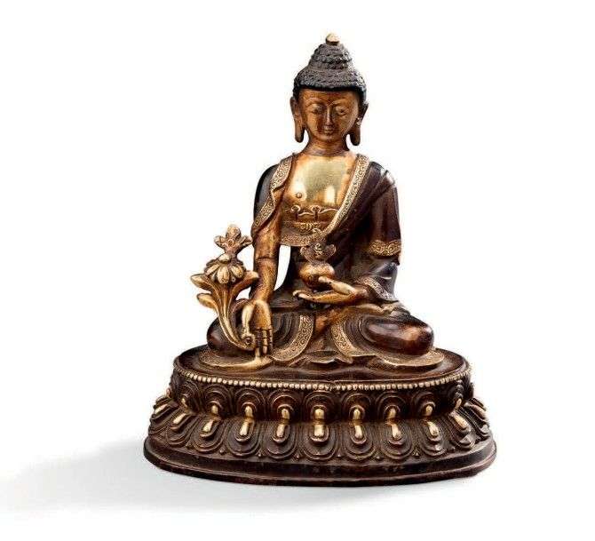 Le Bouddha de la médecine est assis, tenant le bol de médecine et faisant le geste du don de la main droite, de laquelle il tient également une branche d'arura. Bronze doré.