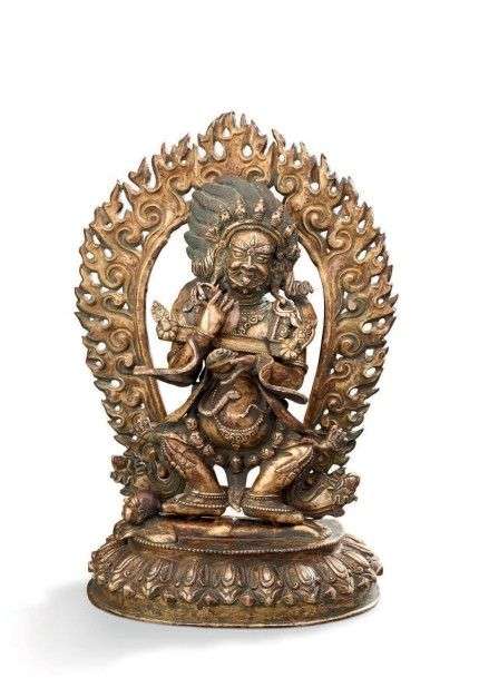 Mahakala protecteur de la tente tenant devant lui le baton, ainsi que le couperet et la coupe crânienne remplie de sang. C'est une représentation de Mahakala très rare en sculpture. Bronze doré.