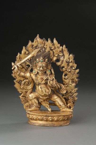 Bhairava forme farouche de Mahakala. La divinité farouche se détache sur fond de mandorle flammée, brandissant une épée, flammée également de la main droite et un lasso de la main gauche.