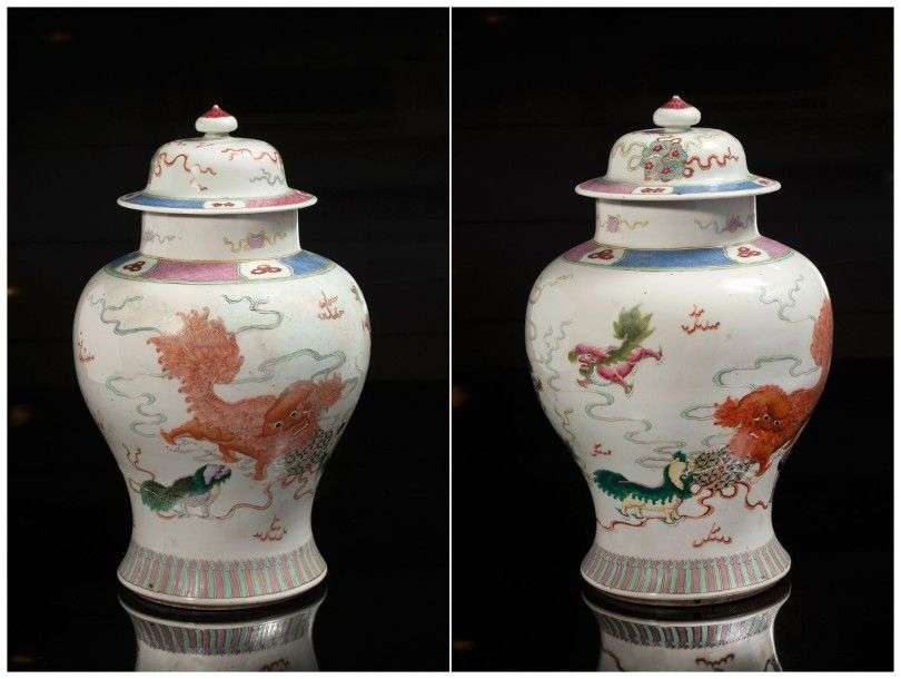 Paire de potiches couvertes de forme balustre, décorées en émaux de la famille rose de Shishi et de chiens de Fô sur fond de nuages, encadrés de fleurs dans des réserves sur fond de quadrillage bleu et rose, d'objets taôistes et de palmes.