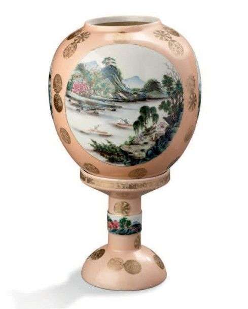 Paysage lacustre peint dans les médaillons sur fond rose saumon pastillé doré. Chine, porcelaine d'exportation, XIXème siècle.