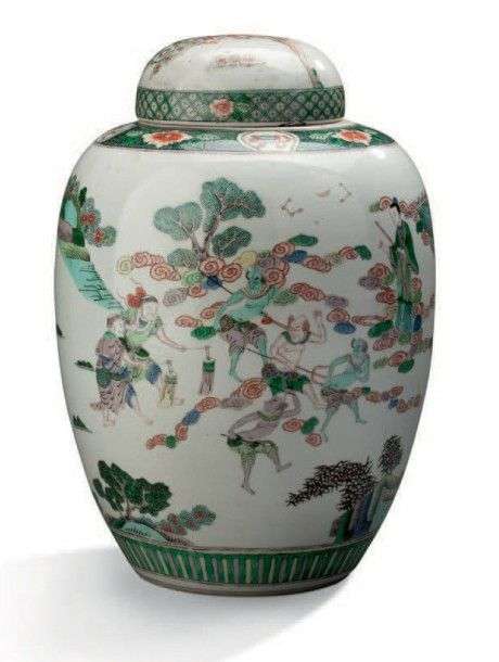 Paire de potiches couvertes en porcelaine de la famille verte à décor de scènes animées de personnages dans un paysage.