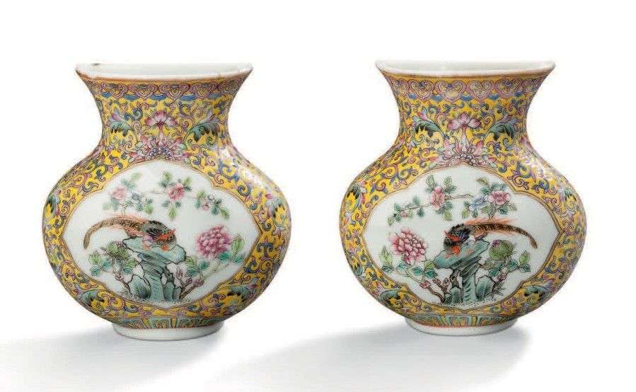 Sur la panse, dans un médaillon en forme de mandorle sont représentés des paons dans des paysages sur fond blanc. Le fond est décoré de végétaux et entrelacs sur fond jaune. Porcelaine à émaux de la famille rose. Marque de Qian