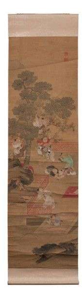 Trois kakemonos enfants jouant. Un déchiré dans le bas