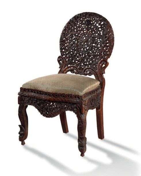 Petite chaise en bois exotique, le dossier ajouré est richement sculpté de rinceaux feuillagés et d'un médaillon orné d'une chimère. Elle repose sur quatre pieds à décor zoomorphe. Travail indo portugais du XIXème siècle