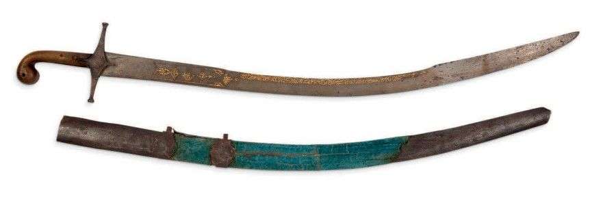 Lame courbe en acier damassé et incrusté à l'or d'une succession de médaillons polylobés: le premier porte une date 712 H., le second le nom de l'artisan, (effacé) et le dernier d'une longue inscription religieuse. Monture en corne sculptée en crosse à garde à croisière simple.