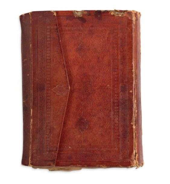 Reliure à rabat en cuir grenat à décor estampé d'un médaillon central à appendices.