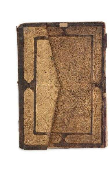Reliure à rabat en cuir gaufré et doré présentant un arc et rinceaux enchevêtrés, ceint d'inscriptions religieuses. Revers découpé, d'une mandorle polylobée et écoinçons tapissés d'une résille de rinceaux sur fond polychrome.
