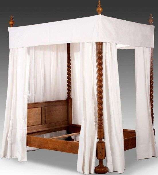 Lit en baladaquin en noyer quatre colonnes tournéees à torses symétriques, couronné de quatre toupies au dessus du ciel, la tête du lit est panneautés et mouluré.