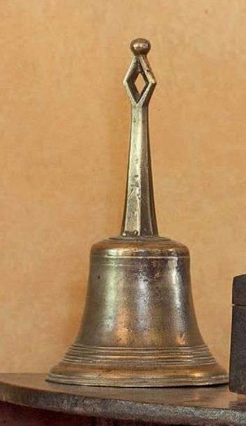Cloche d'office en bronze, la prise à pans coupés, partiellement ajourée.