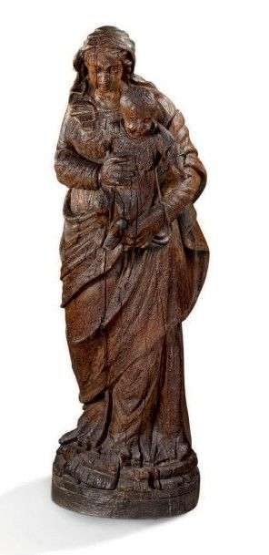 Vierge à l'enfant en noyer polychromée reposant sur une base moulurée de fleurs de lotus.