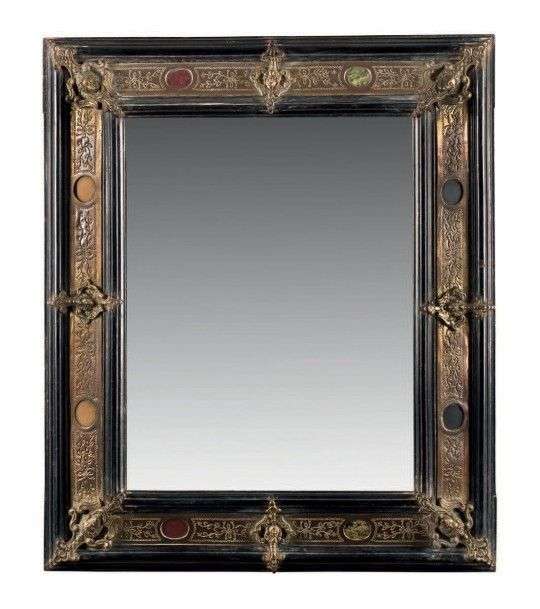 Petit miroir en bois noirci encadrant une bordure de cuivre doré et gravé à décor de cabochons de pierres dures et motifs en agrafes.