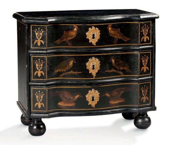 Petite commode miniature en bois laqué noir à décor or, d'oiseaux et motif