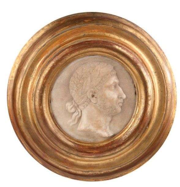 Médaillon en marbre blanc sculpté d'un profil d'empereur.