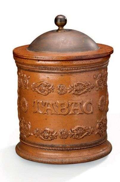 Pot à tabac en terre vernissée, à décor de fleurettes, agrafes, femme en train de priser et fumeur de pipe.