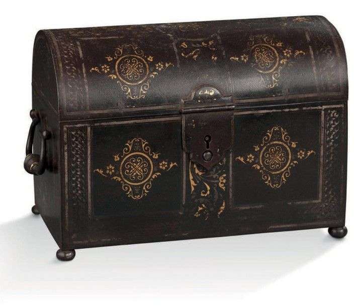 Coffret en acier, à couvercle bombé, à décor or imitant le damasquinage. D