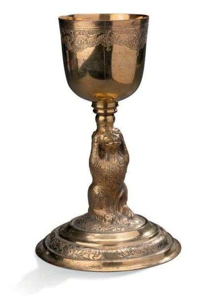Calice en métal doré. Le fût à décor d'un ours repose sur une base circulaire ornée d'une frise d'acanthe et supporte la coupe gravée de festons.