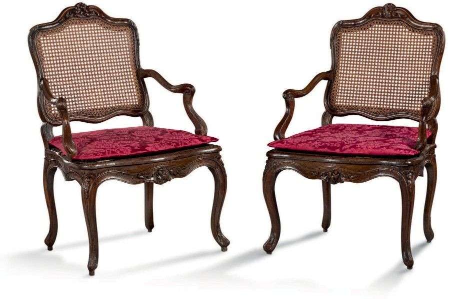Paire de fauteuils à dos plat en noyer mouluré et sculpté de fleurettes et acanthes. Bras et pieds cambrés.