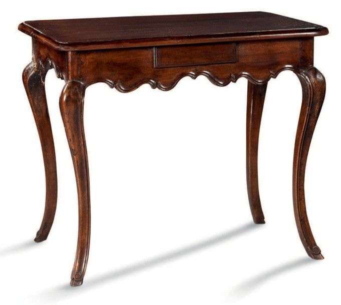 Petite table en noyer naturel mouluré. Elle ouvre par un tiroir en façade et repose sur quatre pieds nervurés à enroulement.
