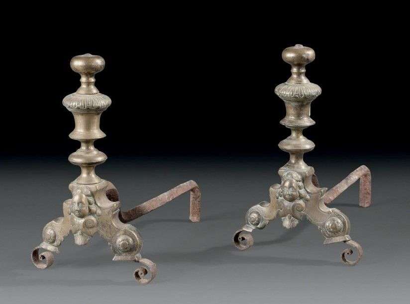 Paire de chenêts à marmouset en bronze fût tourné en balustre à godrons, t