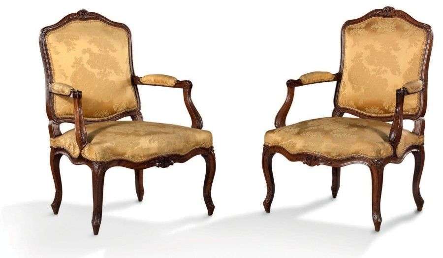 Paire de fauteuils à dos plat en noyer mouluré et sculpté à décor de rosaces et acanthes.