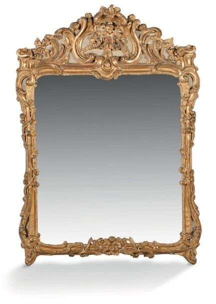 Important miroir en bois sculpté laqué crème et doré.