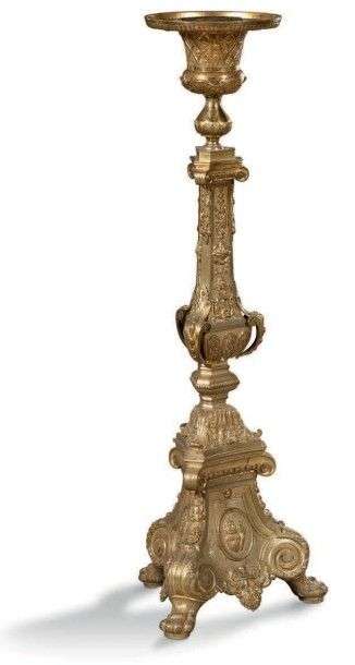 Porte torchère en bronze ciselé et doré. Le fut de forme balustre supporte