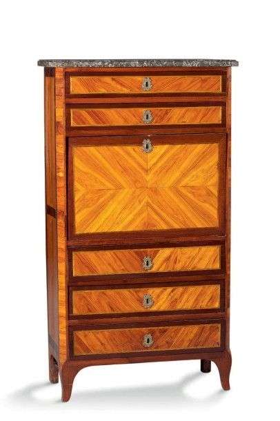 Secrétaire de forme rectangulaire en placage de bois de rose dans des encadrements de filets teintés vert et amarante. Il ouvre par cinq tiroirs et un abattant découvrant des tiroirs et casiers.