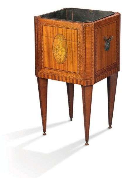 Jardinière en marqueterie à décor de filets et coquillages dans des médaillons.