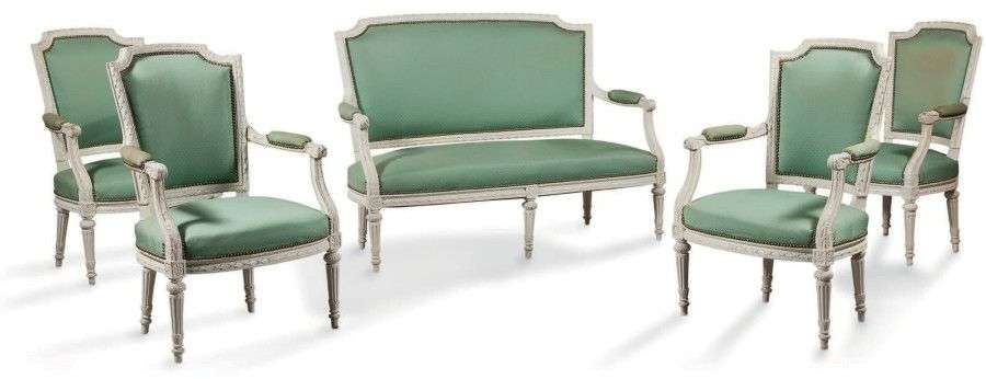 Mobilier de salon comprenant quatre fauteuils et un canapé en bois mouluré